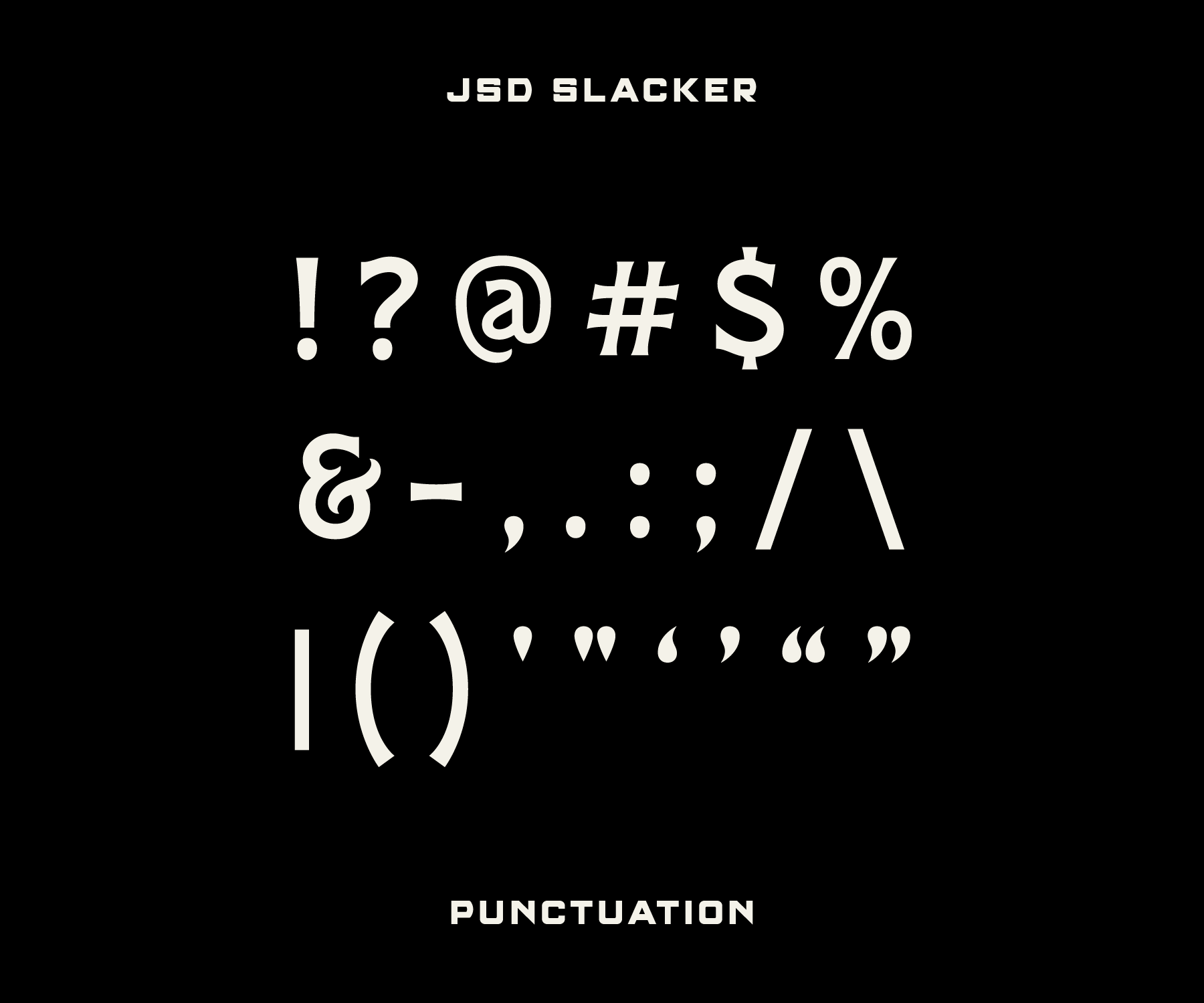 My goal when designing the letterforms was to create shapes that are unique but not overly quirky. When letters are too experimental, it greatly impacts not only the legibility and appeal of the typeface, but its usage as well. I wanted Slacker to be a typeface that anyone could reach for to give their project some extra flair while keeping things tasteful. Timeless always beats trendy.
